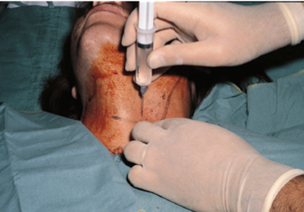 After the numbing medicine takes effect the doctor will insert another needle, and with the assistance of a special X-ray machine called a fluoroscope, inject a radiopaque dye (contrast solution) to confirm correct needle position. When satisfied with the needle position, the doctor will inject a small mixture of numbing medicine (anesthetic) and anti-inflammatory medicine (cortisone/steroid).